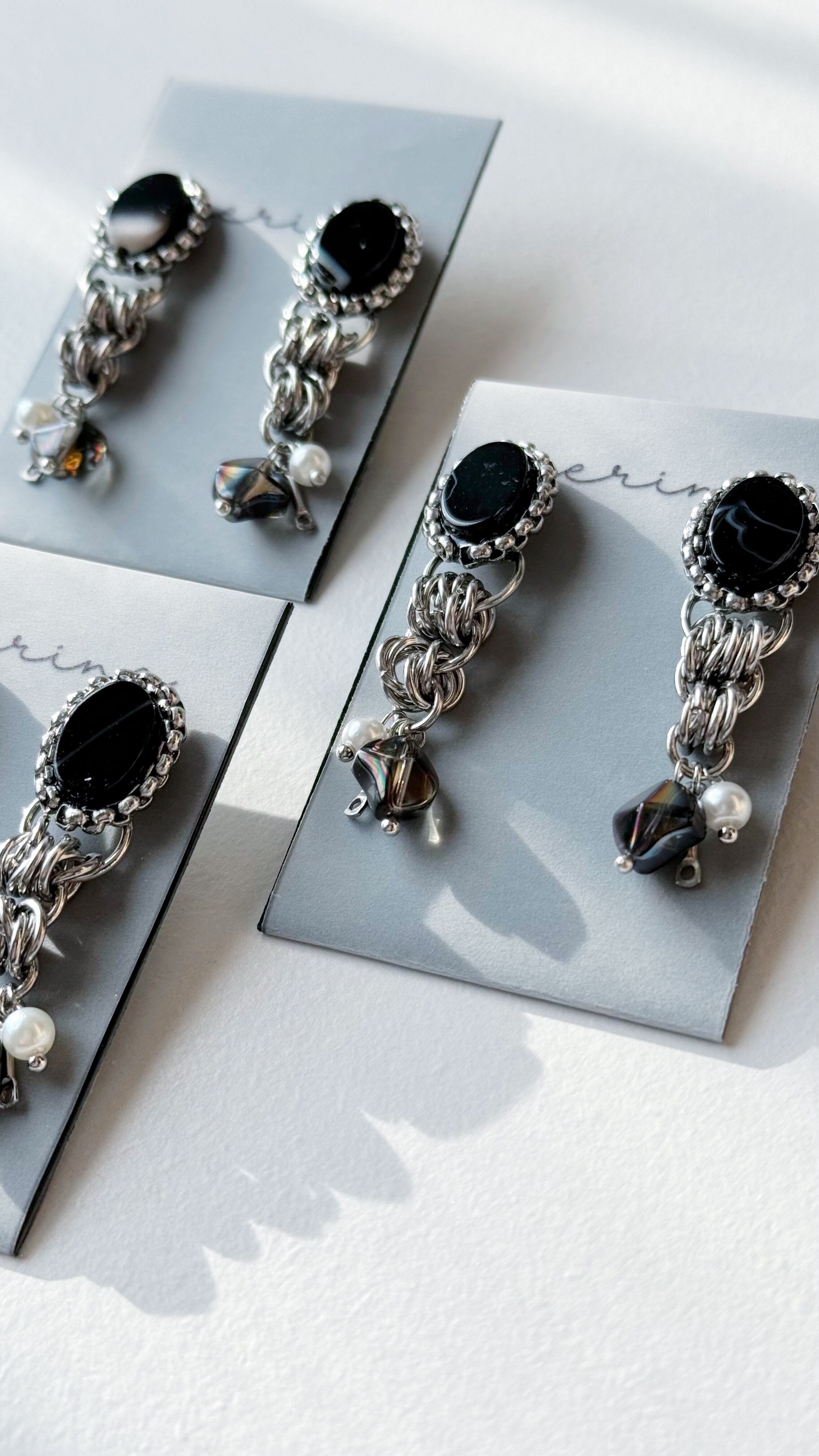 ブラックカラーの天然石ビーズを使用した重厚感のある大人なデザインとなっています。