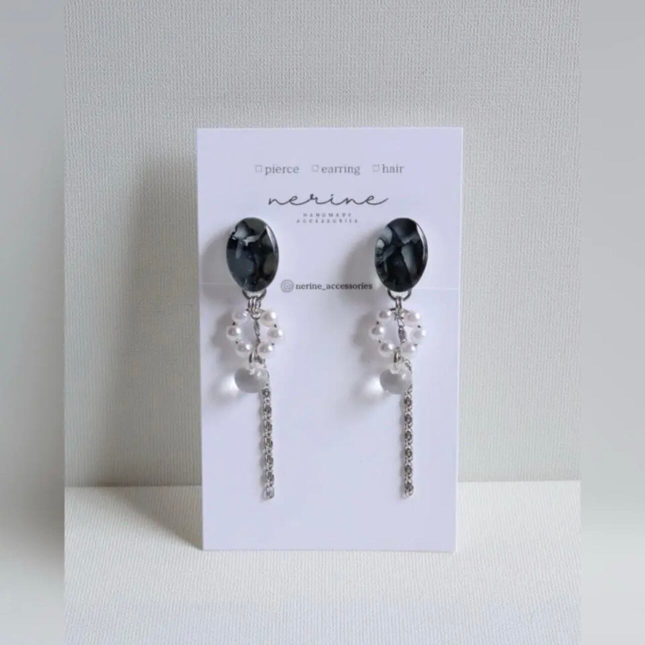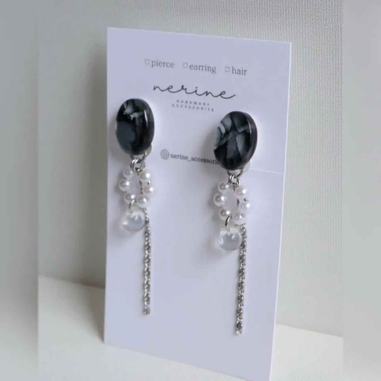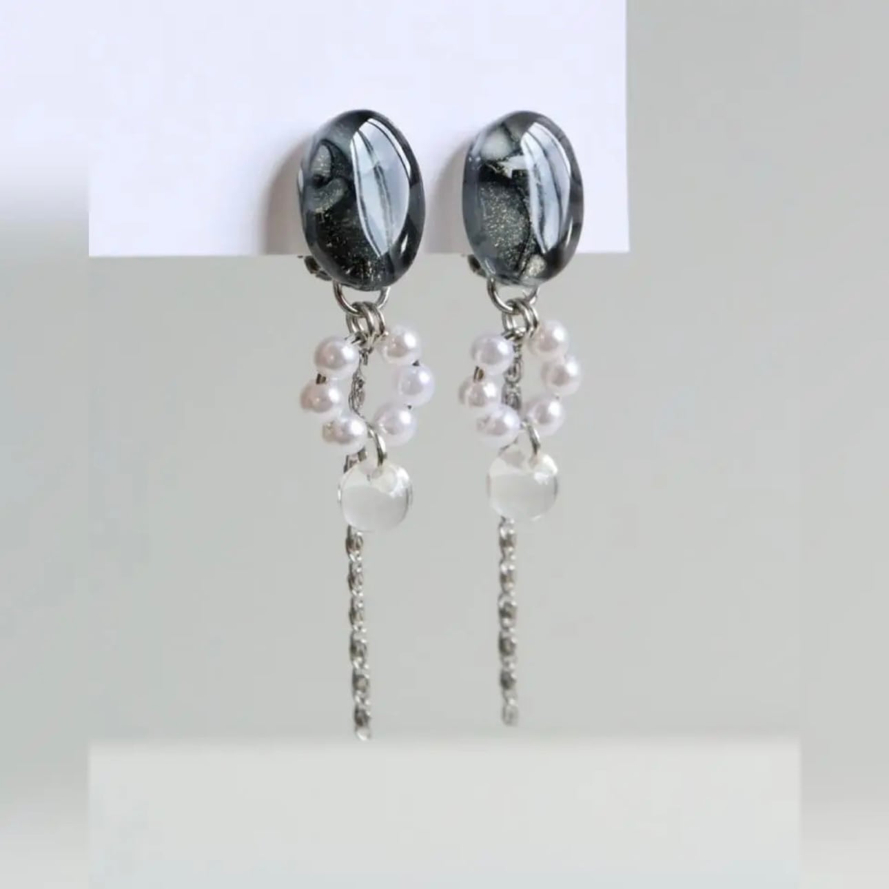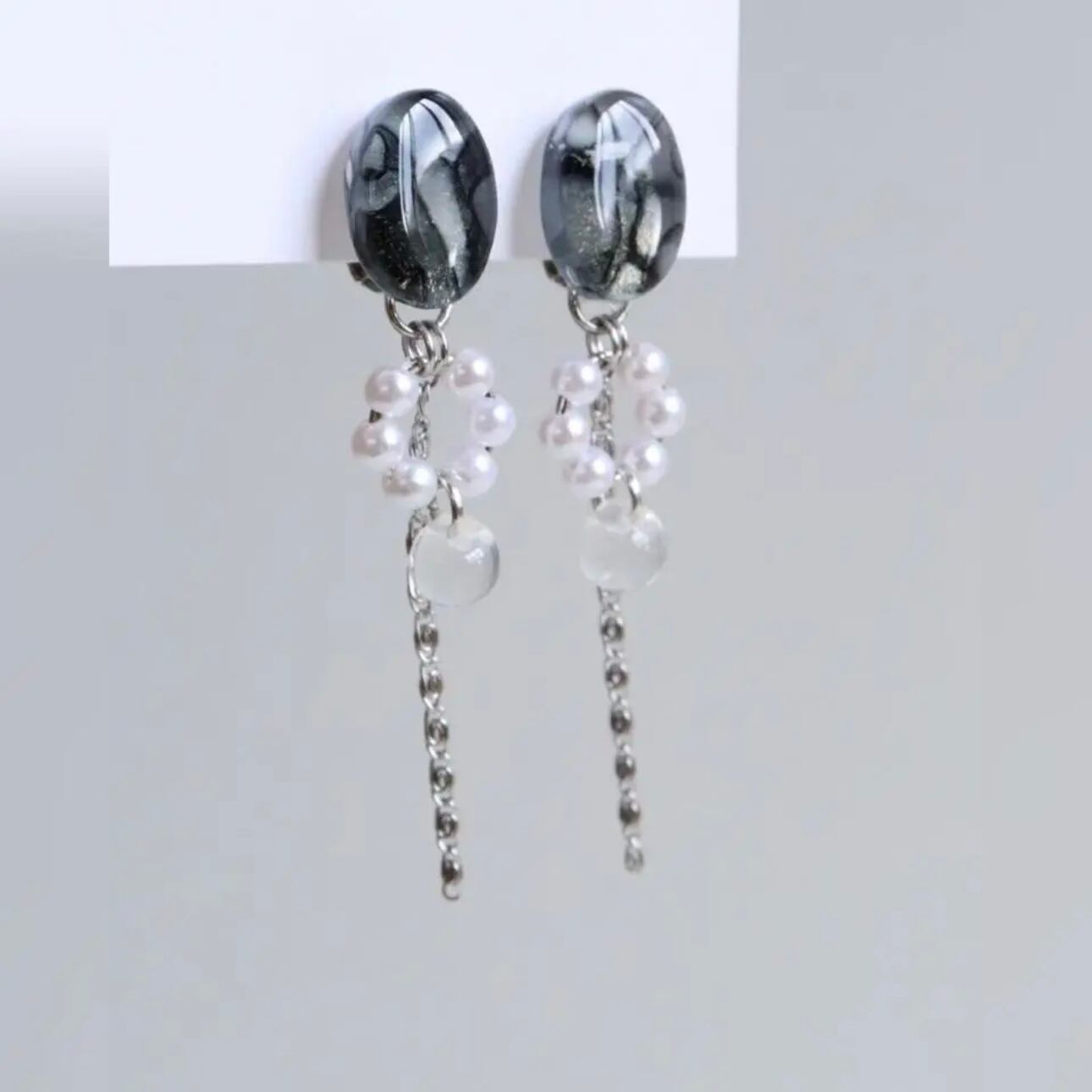 アルコールインクアート 色彩 幻想的 ユニーク 個性的 上品 特別な日 日常使い 唯一無二 アートピース カジュアルスタイル 揺れるピアス ニュアンス ブラック モノトーン